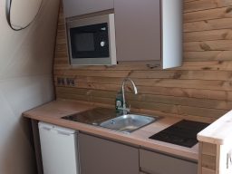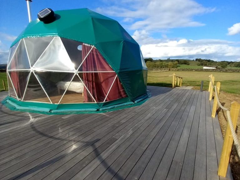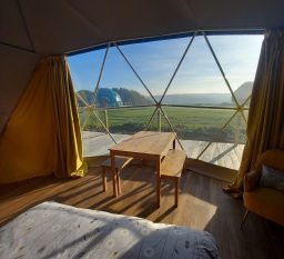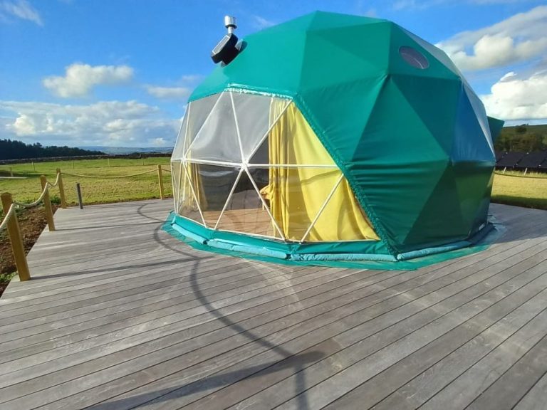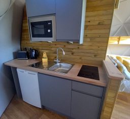 This 7 meter fully insulated dome has 40sqm of floor space making it spacious enough for a family whilst still being cosy and snug for couples. It has everything you will need to make your stay a relaxing one, from ensuite shower room, fully equipped private kitchen, wood burning stove and sumptuous bedding.