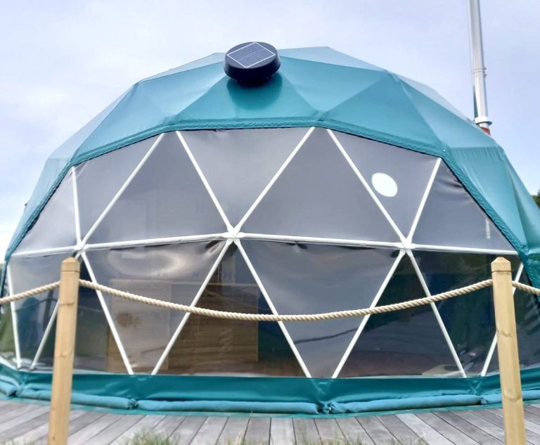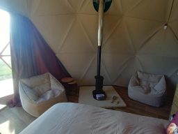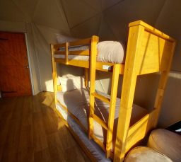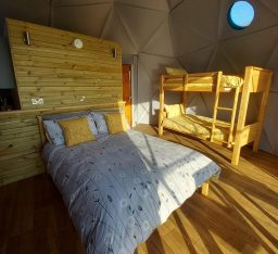 This huge 7-meter geodesic dome sleeps up to 5 people as it has a double bed, bunk beds (suitable for adults and children) and a trundle bed making it the perfect space for a family or group but still inviting and intimate for couples looking for a romantic hideaway.