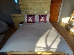 The dome can sleep up to 4 people as it has a double bed and bunk beds which are suitable for adults and children. We can also add a travel cot free of charge. Sitches has its own decking with table and chairs to enjoy the outdoors.